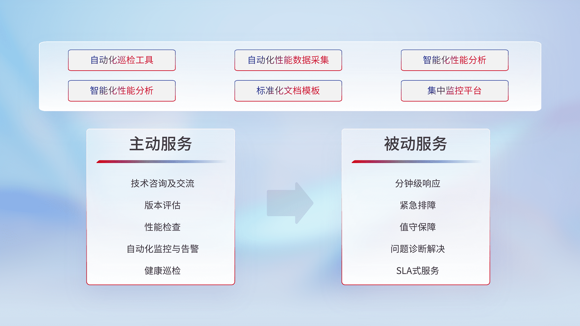智能化工具和标准化文档,,,,保障服务质量,,提供主动服务(包含技术咨询、、、版本评估、、、、性能检查、、自动化监控与告警、、、健康巡检)和被动服务包含(分钟级响应、、紧急排障、、、、值守保障、、、问题诊断解决、、、、SLA服务)。。。